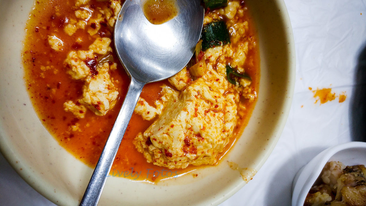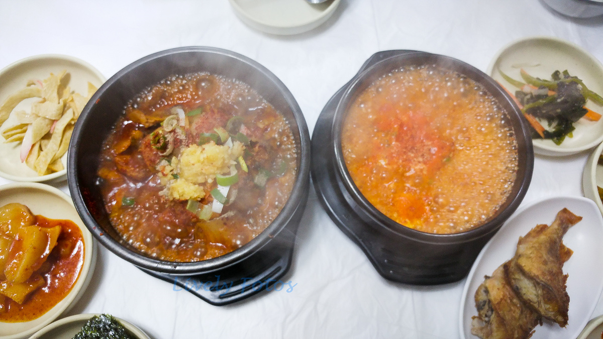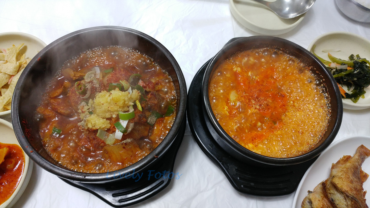 김치뽀글이와 순두부찌개를 주문했습니다. 여러가지의 밑반찬이 깔린후 얼마후에 나온 김치뽀글이와 보글보글 끓고 있는 순두부찌개가 먹음직스러웠습니다.