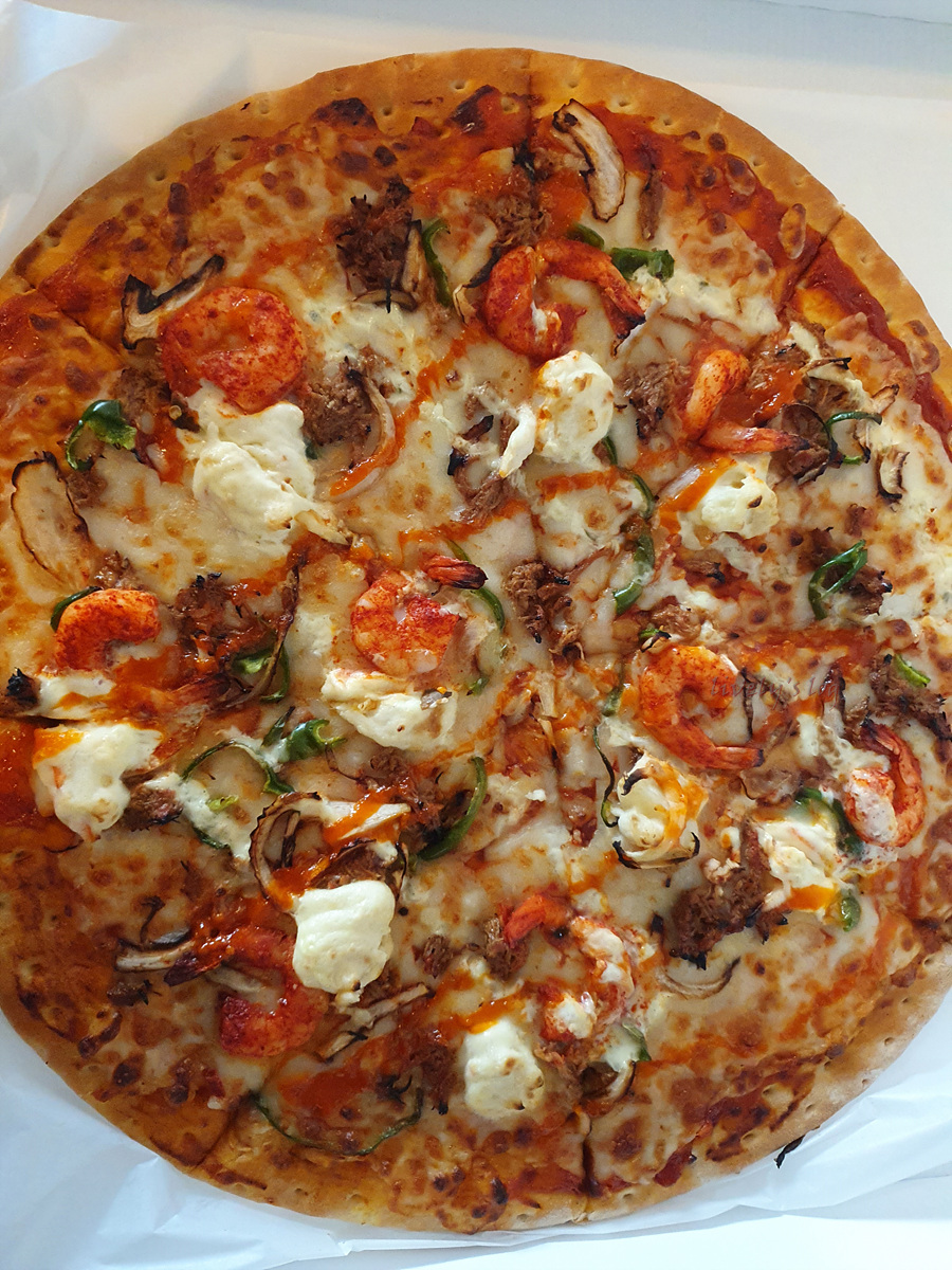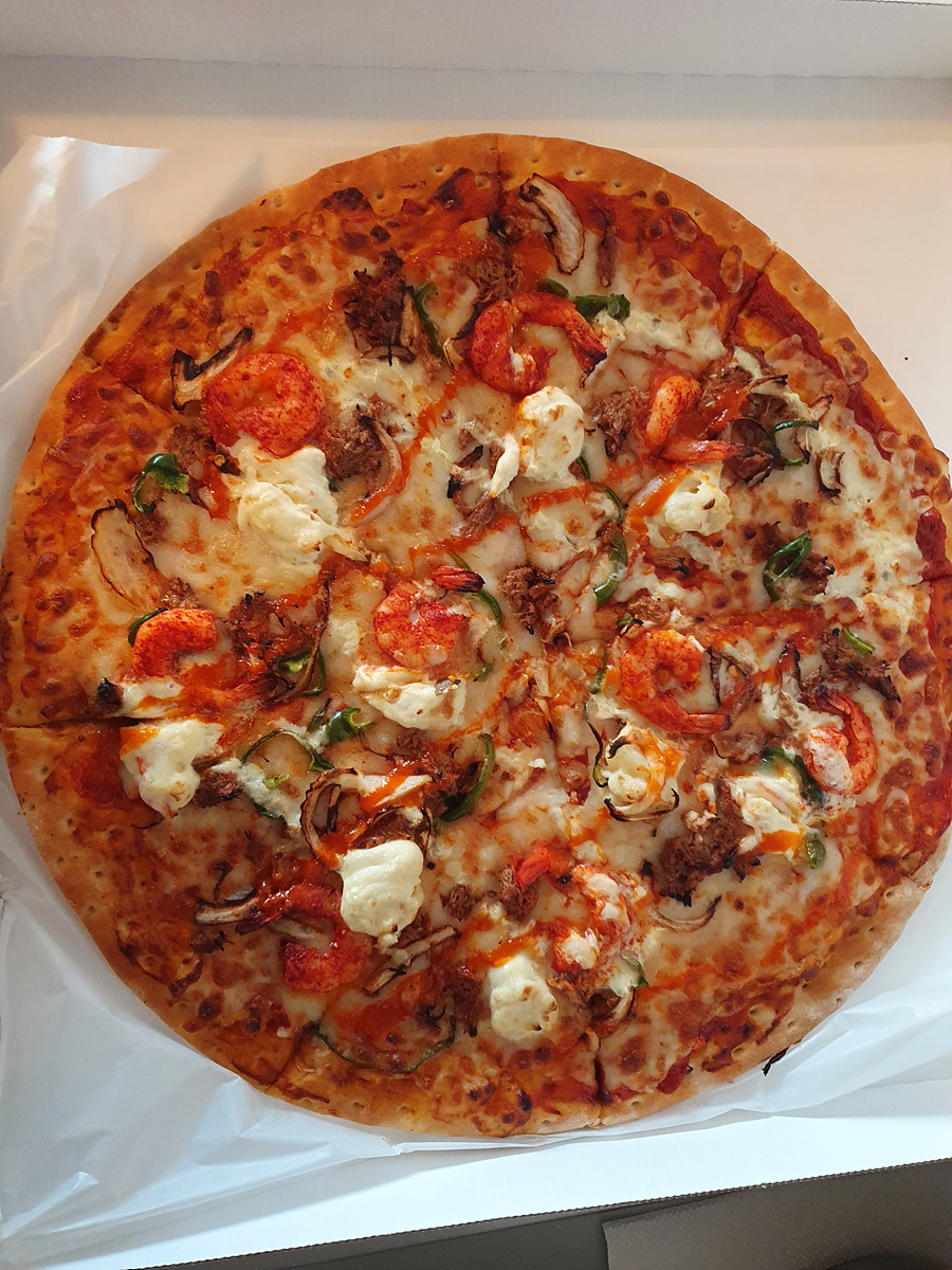 토핑으로 새우,치킨 약간의 피망, 양파 그리고 흰색으로 보이는것은 감자입니다.