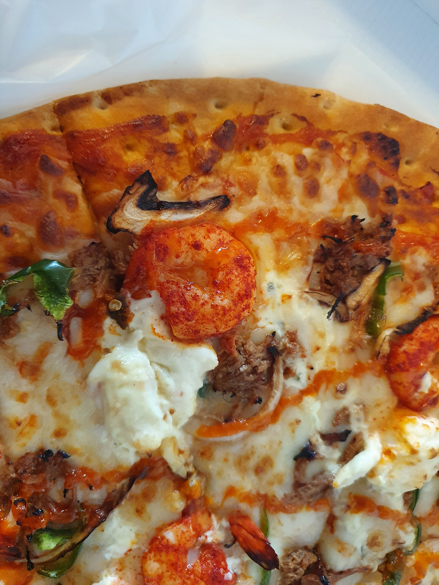 토핑으로 올라간 새우도 큼직하고 풀드 치킨이라 더 부드럽게 느껴집니다.