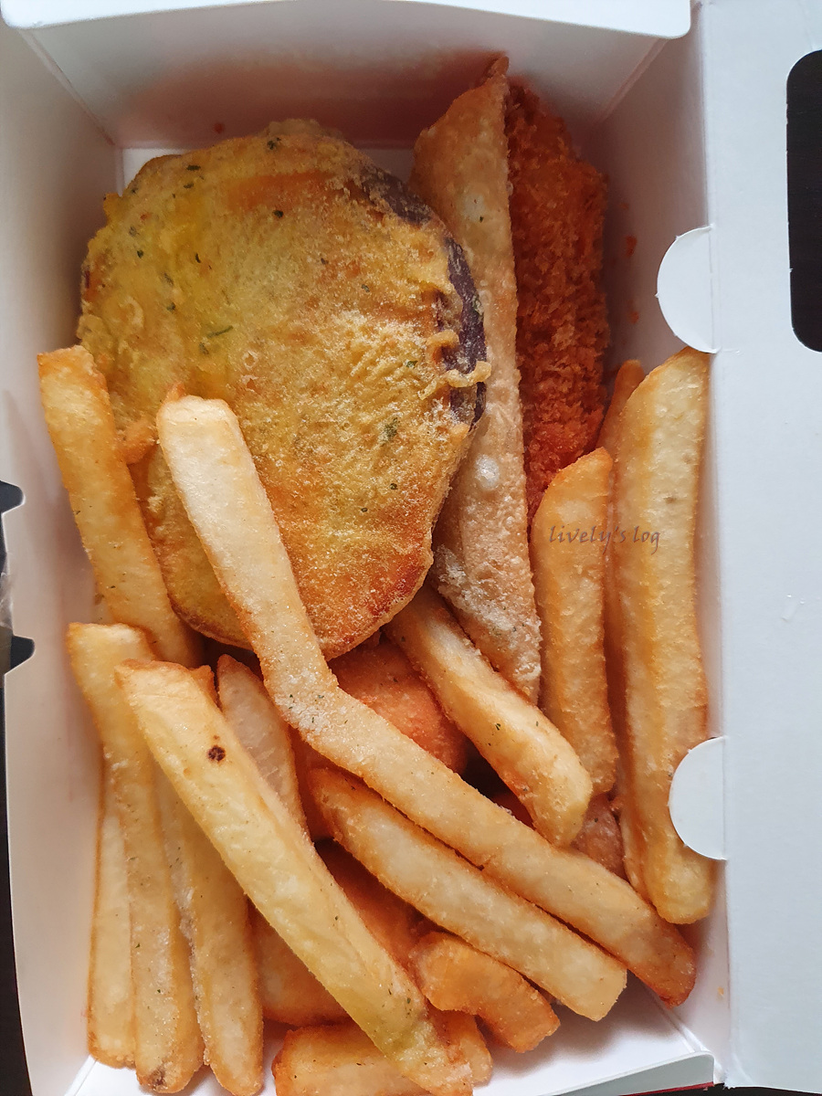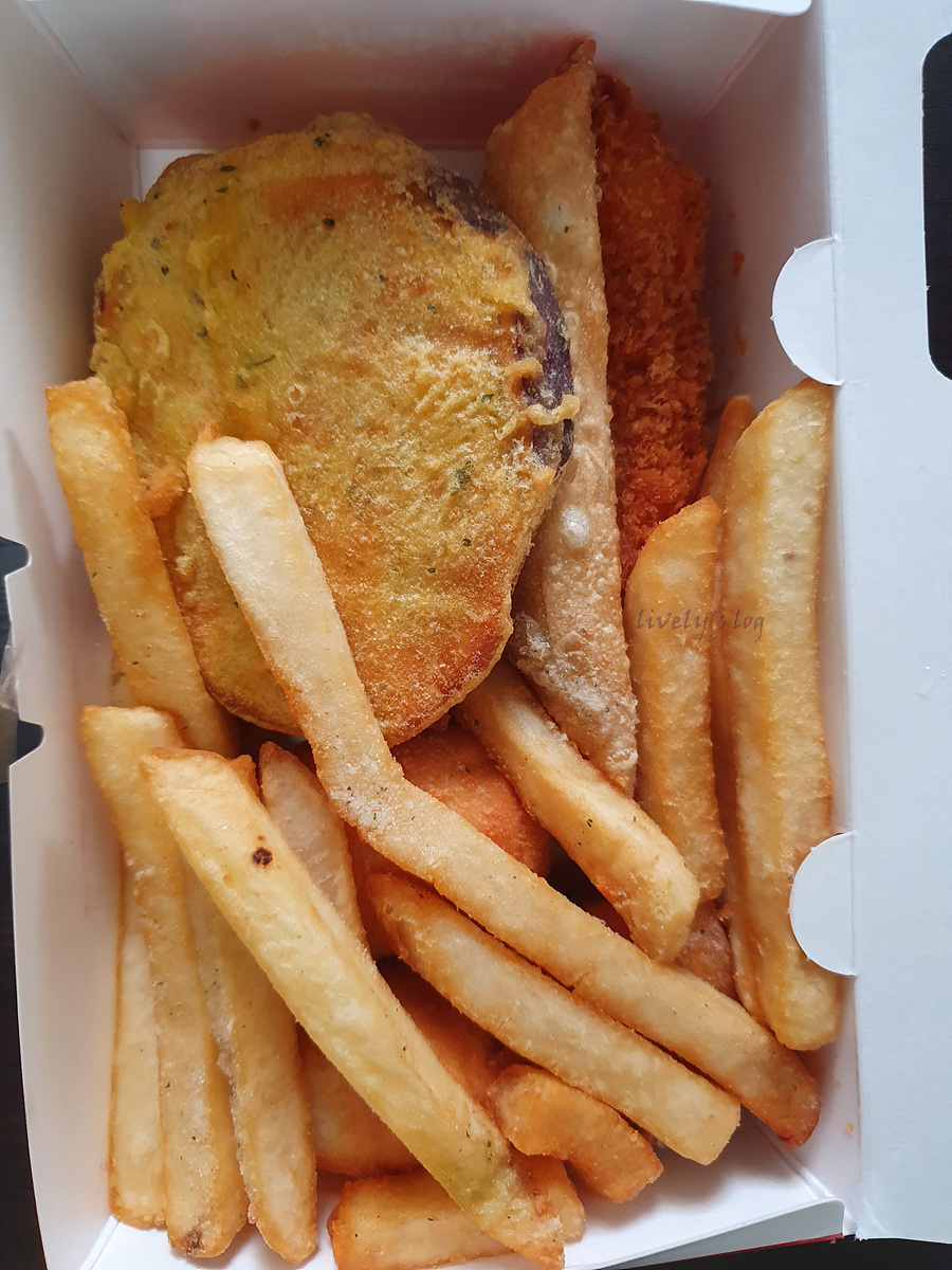 모둠튀김 (대,6000원) 입니다. 고구마튀김, 새우튀김,감자튀김,쫀도그,만두,멘보샤,흑당치즈볼이 있는데 모두 바삭하고 맛있었습니다.